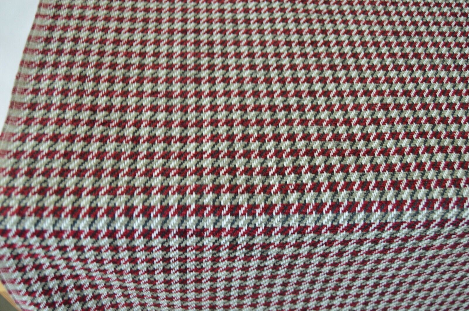 Lovely burgundy beige, dog tooth design upholstery fabric. A top quality fabric. A durable and robust, fire retardant treated upholstery fabric. Ideal for upholstery projects, caravan, sofa, chairs etc. This is a clearance fabric from a top sofa manufacturer.