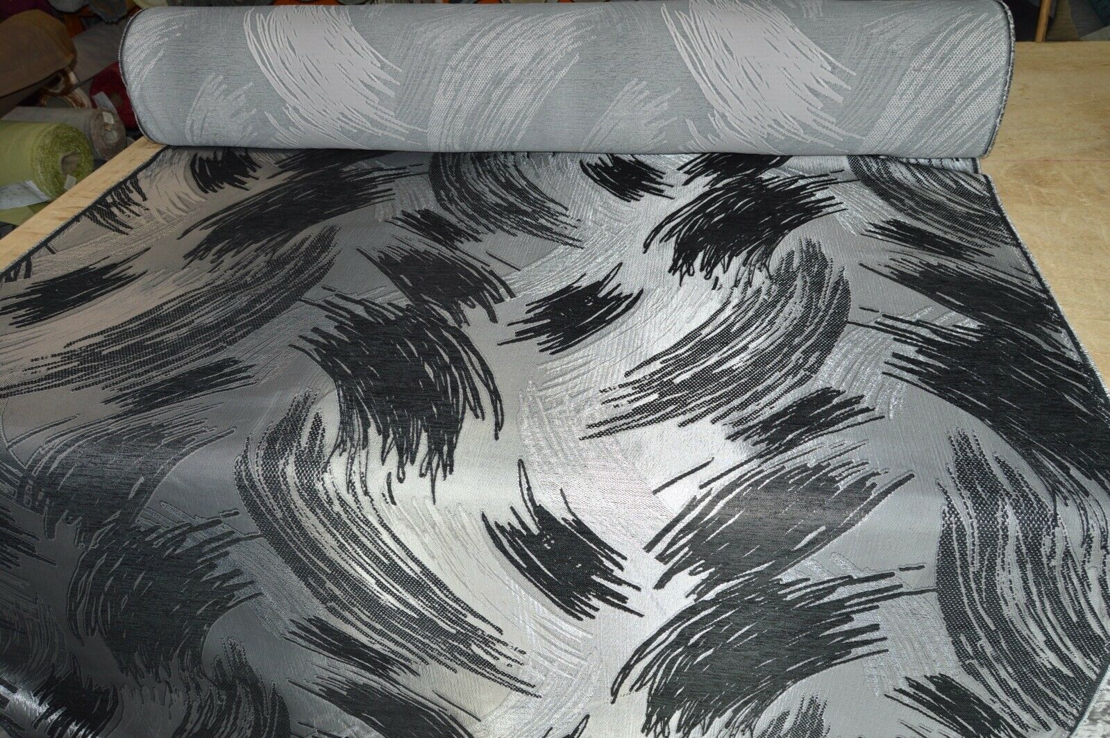 Lovely black geometric design on a metallic silver back ground upholstery fabric. A top quality fabric. A durable and robust, fire retardant treated upholstery fabric. Ideal for upholstery projects, caravan, sofa, chairs etc. This is a clearance fabric from a top sofa manufacturer.
