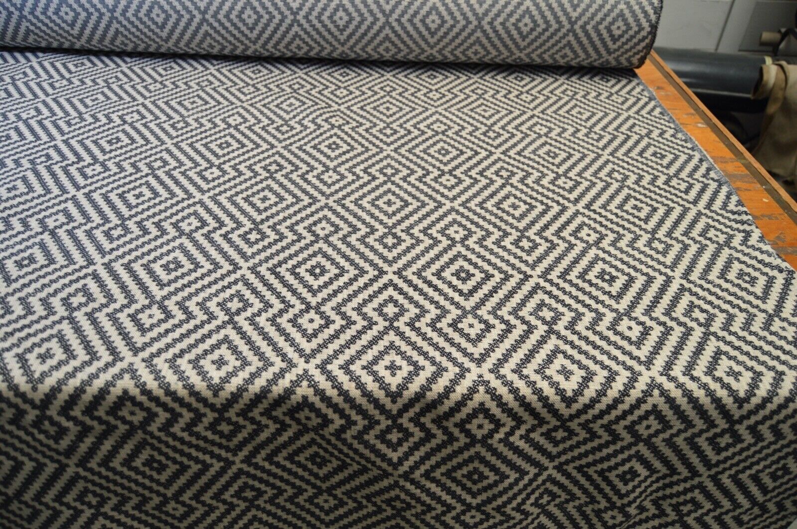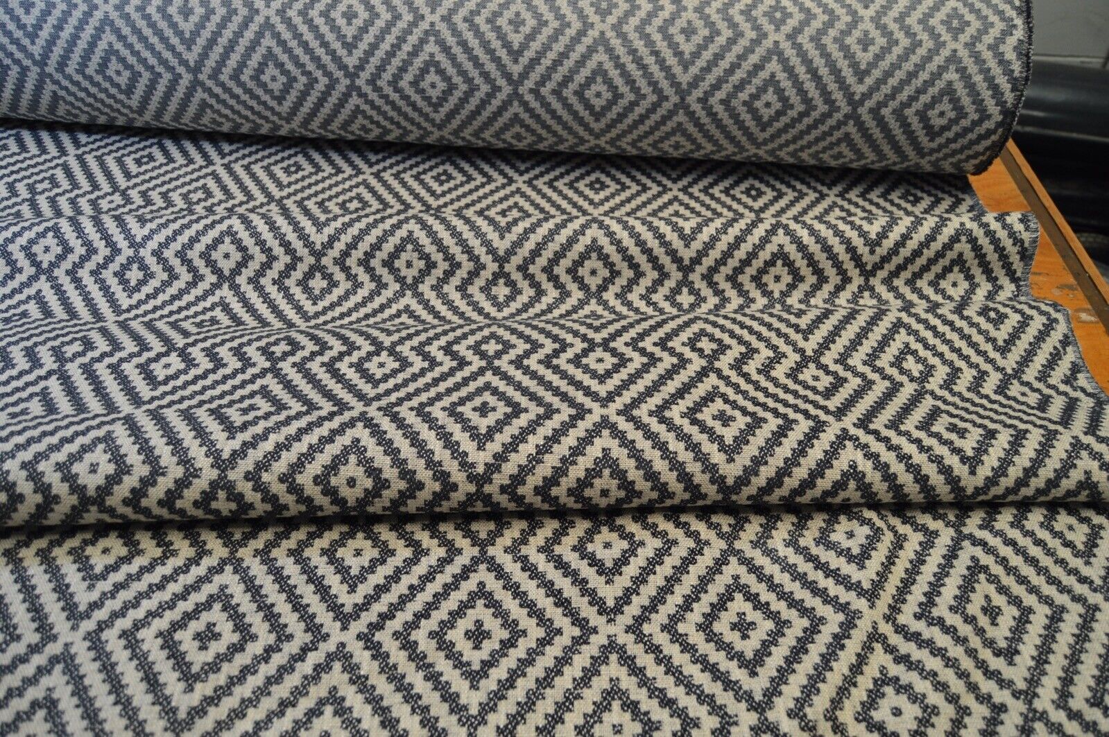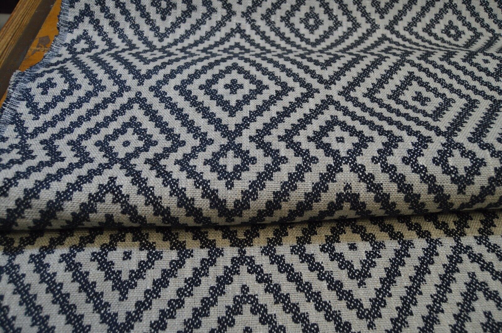 upholstery fabric blue & cream linen style weave geometric design robust