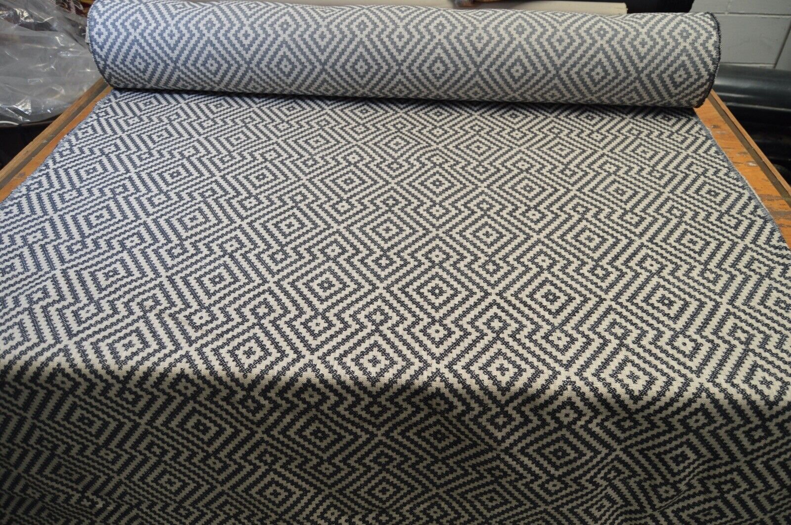 Lovely geometric design, blue and cream, linen style, geometric design weave upholstery fabric. A top quality fabric. A durable and robust, fire retardant treated upholstery fabric. Ideal for upholstery projects, caravan, sofa, chairs etc. This is a clearance fabric from a top sofa manufacturer.