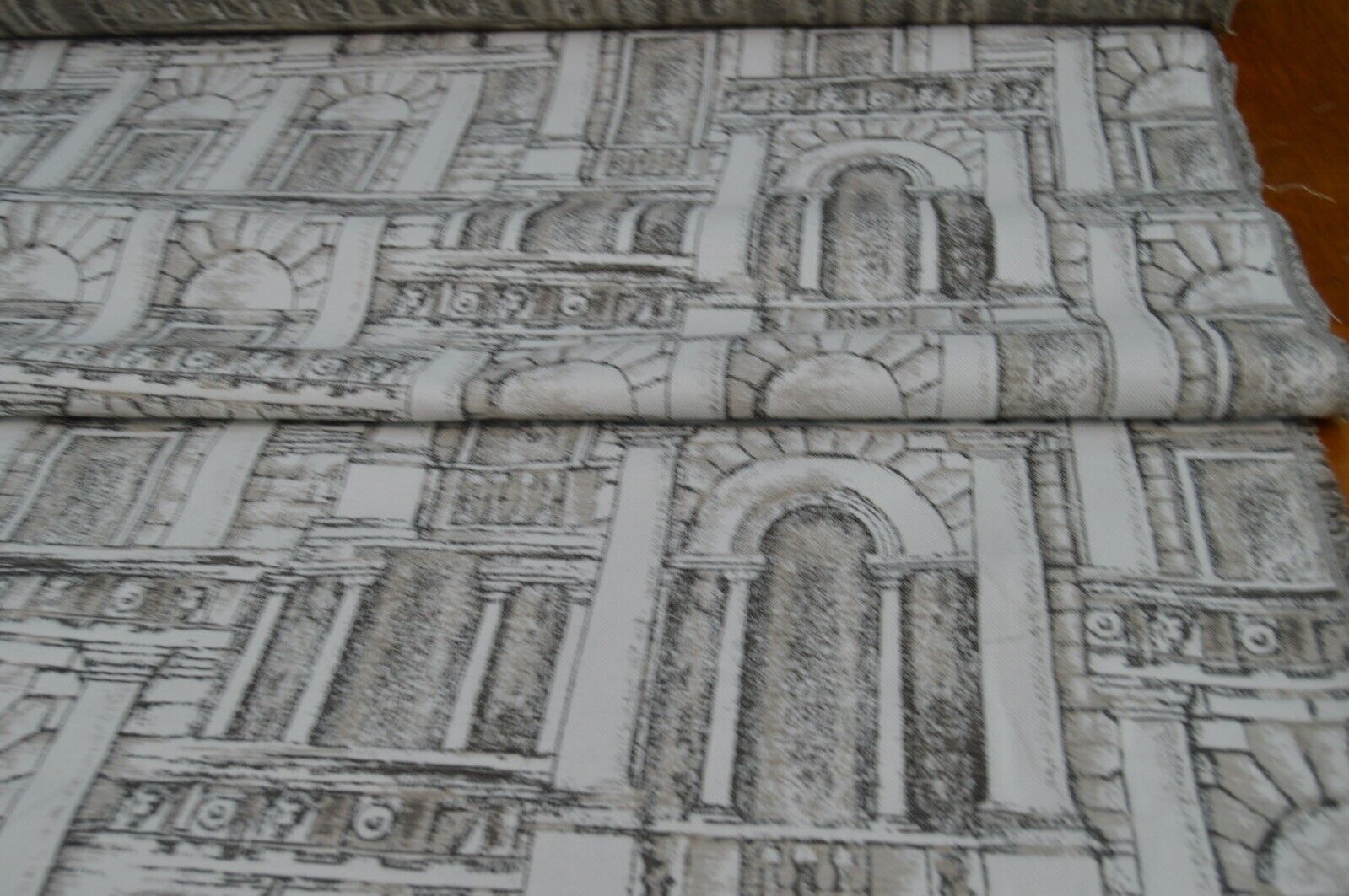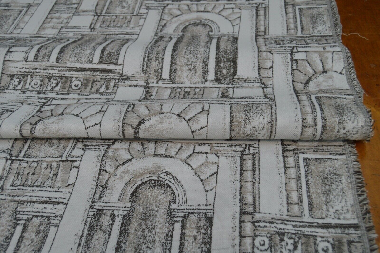 Lovely novelty roman architectural, pillar, arch, stone design upholstery fabric. A top quality fabric. A durable and robust, fire retardant treated upholstery fabric. Ideal for upholstery projects, caravan, sofa, chairs etc. This is a clearance fabric from a top sofa manufacturer.