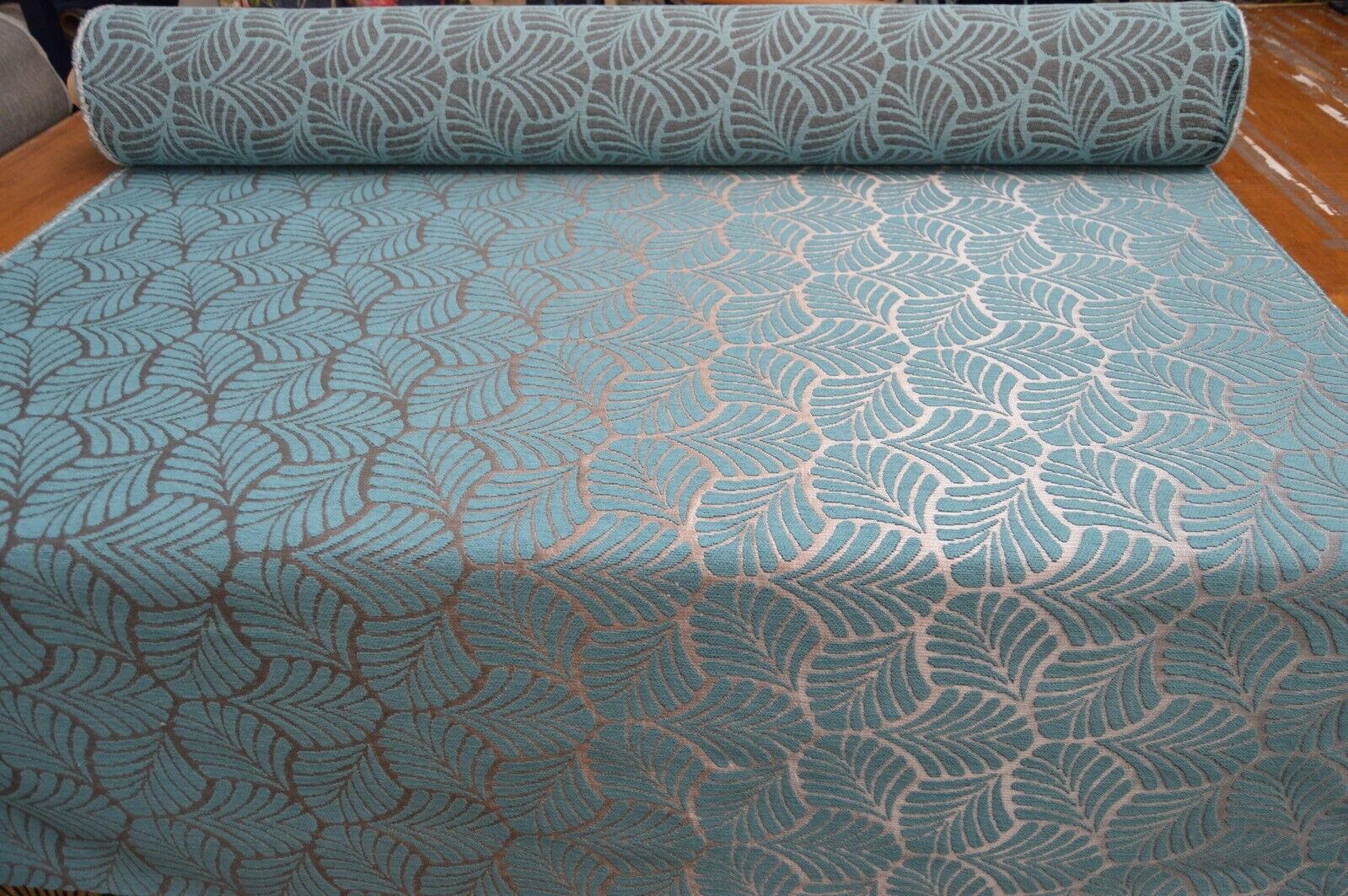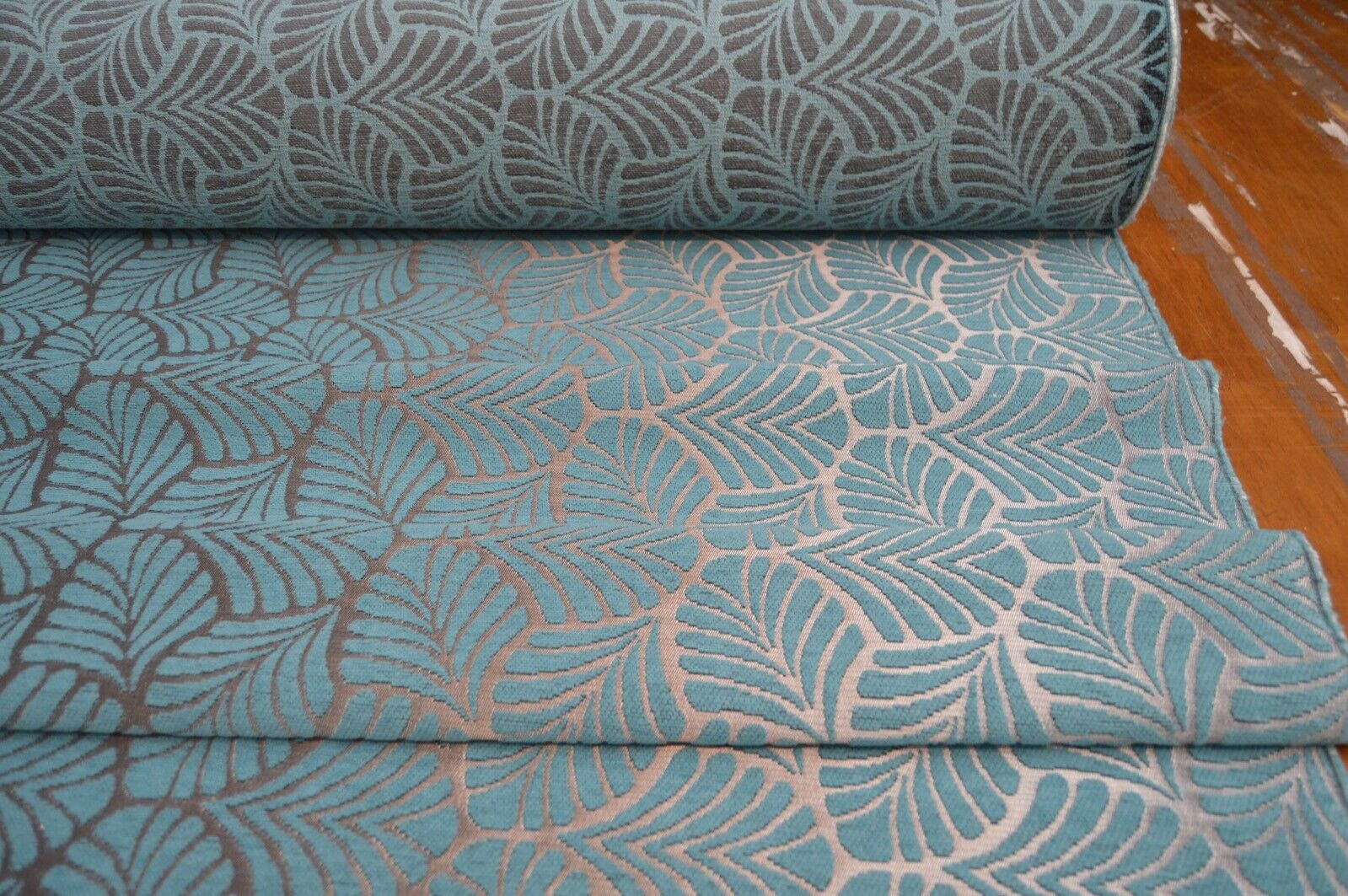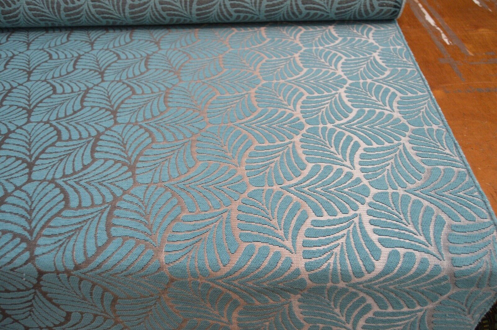 upholstery fabric teal metallic silver geometric leaf chenille robust durable